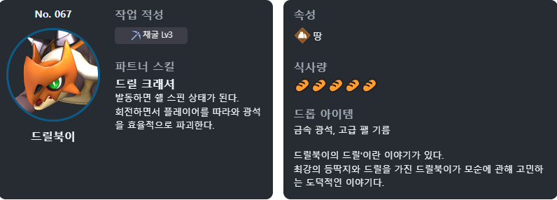 팰월드 드릴북이 위치와 교배 정보 정리 - PALWORLD 팰월드의 드릴북이 위치와 교배 정보를 정리했습니다. 작업 적성 및 스킬 정보를 함께 확인하세요. 1. 드릴북이 작업 적성 및 스킬 드릴북이의 작업 적성 및 스킬은 다음과 같습니다. 2. 드릴북이 위치 (출현 장소) 드릴북이의 출현 장소는 다음과 같습니다. 3. 드릴북이 교배 배합표 드릴북이의 교배 배합표는 다음과 같습니다. PC게임 정보/팰월드 2024.02.16