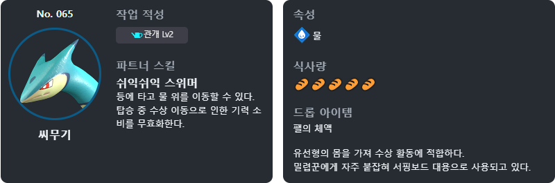 팰월드 씨무기 위치와 교배 정보 정리 - PALWORLD 팰월드의 씨무기 위치와 교배 정보를 정리했습니다. 작업 적성 및 스킬 정보를 함께 확인하세요. 1. 씨무기 작업 적성 및 스킬 씨무기의 작업 적성 및 스킬은 다음과 같습니다. 2. 씨무기 위치 (출현 장소) 씨무기의 출현 장소는 다음과 같습니다. 3. 씨무기 교배 배합표 씨무기의 교배 배합표는 다음과 같습니다. PC게임 정보/팰월드 2024.02.16
