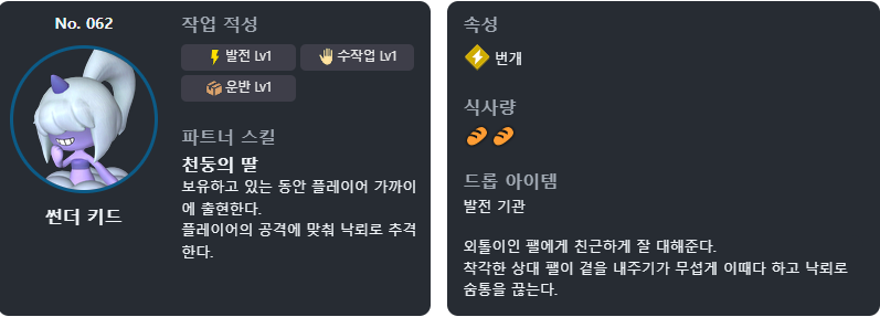 팰월드 썬더키드 위치와 교배 정보 정리 - PALWORLD 팰월드의 썬더키드 위치와 교배 정보를 정리했습니다. 작업 적성 및 스킬 정보를 함께 확인하세요. 1. 썬더키드 작업 적성 및 스킬 썬더키드의 작업 적성 및 스킬은 다음과 같습니다. 2. 썬더키드 위치 (출현 장소) 썬더키드의 출현 장소는 다음과 같습니다. 3. 썬더키드 교배 배합표 썬더키드의 교배 배합표는 다음과 같습니다. PC게임 정보/팰월드 2024.02.16