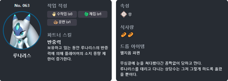 팰월드 루나리스 위치와 교배 정보 정리 - PALWORLD 팰월드의 루나리스 위치와 교배 정보를 정리했습니다. 작업 적성 및 스킬 정보를 함께 확인하세요. 1. 루나리스 작업 적성 및 스킬 루나리스의 작업 적성 및 스킬은 다음과 같습니다. 2. 루나리스 위치 (출현 장소) 루나리스의 출현 장소는 다음과 같습니다. 3. 루나리스 교배 배합표 루나리스의 교배 배합표는 다음과 같습니다. PC게임 정보/팰월드 2024.02.16