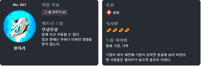 팰월드 불이리 위치와 교배 정보 정리 - PALWORLD 팰월드의 불이리 위치와 교배 정보를 정리했습니다. 작업 적성 및 스킬 정보를 함께 확인하세요. 1. 불이리 작업 적성 및 스킬 불이리의 작업 적성 및 스킬은 다음과 같습니다. 2. 불이리 위치 (출현 장소) 불이리의 출현 장소는 다음과 같습니다. 3. 불이리 교배 배합표 불이리의 교배 배합표는 다음과 같습니다. PC게임 정보/팰월드 2024.02.16