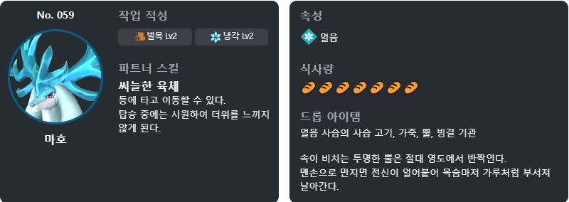 팰월드 마호 위치와 교배 정보 정리 - PALWORLD 팰월드의 마호 위치와 교배 정보를 정리했습니다. 작업 적성 및 스킬 정보를 함께 확인하세요. 1. 마호 작업 적성 및 스킬 마호의 작업 적성 및 스킬은 다음과 같습니다. 2. 마호 위치 (출현 장소) 마호의 출현 장소는 다음과 같습니다. 3. 마호 교배 배합표 마호의 교배 배합표는 다음과 같습니다. PC게임 정보/팰월드 2024.02.16