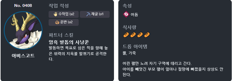팰월드 아비스고트 위치와 교배 정보 정리 - PALWORLD 팰월드의 아비스고트 위치와 교배 정보를 정리했습니다. 작업 적성 및 스킬 정보를 함께 확인하세요. 1. 아비스고트 작업 적성 및 스킬 아비스 고트의 작업 적성 및 스킬은 다음과 같습니다. 2. 아비스고트 위치 (출현 장소) 아비스고트의 출현 장소는 다음과 같습니다. 3. 아비스고트 교배 배합표 아비스고트의 교배 배합표는 다음과 같습니다. PC게임 정보/팰월드 2024.02.16