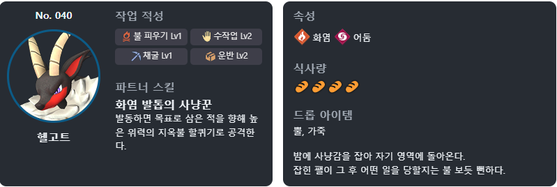 팰월드 헬고트 위치와 교배 정보 정리 - PALWORLD 팰월드의 헬고트 위치와 교배 정보를 정리했습니다. 작업 적성 및 스킬 정보를 함께 확인하세요. 1. 헬고트 작업 적성 및 스킬 헬고트의 작업 적성 및 스킬은 다음과 같습니다. 2. 헬고트 위치 (출현 장소) 헬고트의 출현 장소는 다음과 같습니다. 3. 헬고트 교배 배합표 헬고트의 교배 배합표는 다음과 같습니다. PC게임 정보/팰월드 2024.02.16