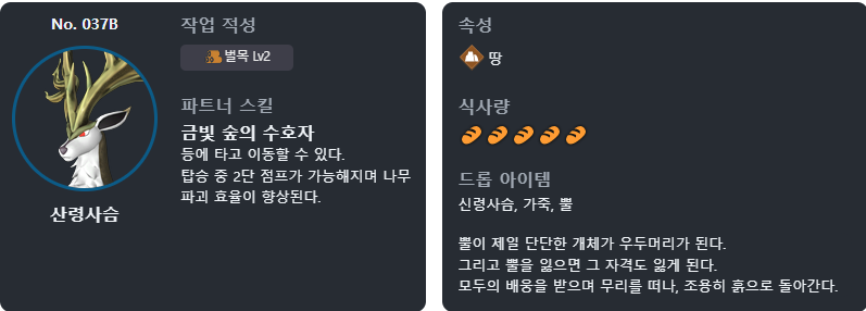 팰월드 산령사슴 위치와 교배 정보 정리 - PALWORLD 팰월드의 산령사슴 위치와 교배 정보를 정리했습니다. 작업 적성 및 스킬 정보를 함께 확인하세요. 1. 산령사슴 작업 적성 및 스킬 산령사슴의 작업 적성 및 스킬은 다음과 같습니다. 2. 산령사슴 위치 (출현 장소) 산령사슴의 출현 장소는 다음과 같습니다. 3. 산령사슴 교배 배합표 산령사슴의 교배 배합표는 다음과 같습니다. PC게임 정보/팰월드 2024.02.15