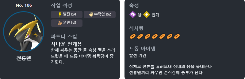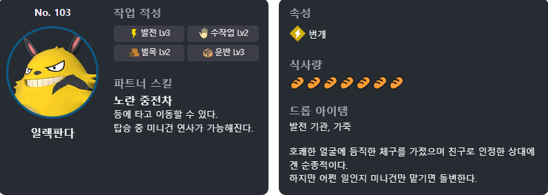 팰월드 일렉판다 위치와 교배 정보 정리 - PALWORLD 팰월드의 일렉판다 위치와 교배 정보를 정리했습니다. 작업 적성 및 스킬 정보를 함께 확인하세요. 1. 일렉판다 작업 적성 및 스킬 일렉판다의 작업 적성 및 스킬은 다음과 같습니다. 2. 일렉판다 위치 (출현 장소) 일렉판다의 출현 장소는 다음과 같습니다. 3. 일렉판다 교배 배합표 일렉판다의 교배 배합표는 다음과 같습니다. PC게임 정보/팰월드 2024.02.17