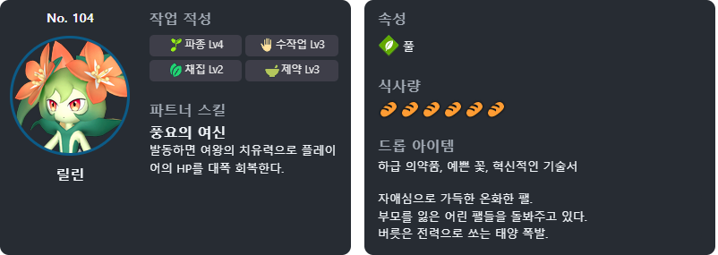 팰월드 릴린 위치와 교배 정보 정리 - PALWORLD 팰월드의 릴린 위치와 교배 정보를 정리했습니다. 작업 적성 및 스킬 정보를 함께 확인하세요. 1. 릴린 작업 적성 및 스킬 릴린의 작업 적성 및 스킬은 다음과 같습니다. 2. 릴린 위치 (출현 장소) 릴린의 출현 장소는 다음과 같습니다. 3. 릴린 교배 배합표 릴린의 교배 배합표는 다음과 같습니다. PC게임 정보/팰월드 2024.02.17