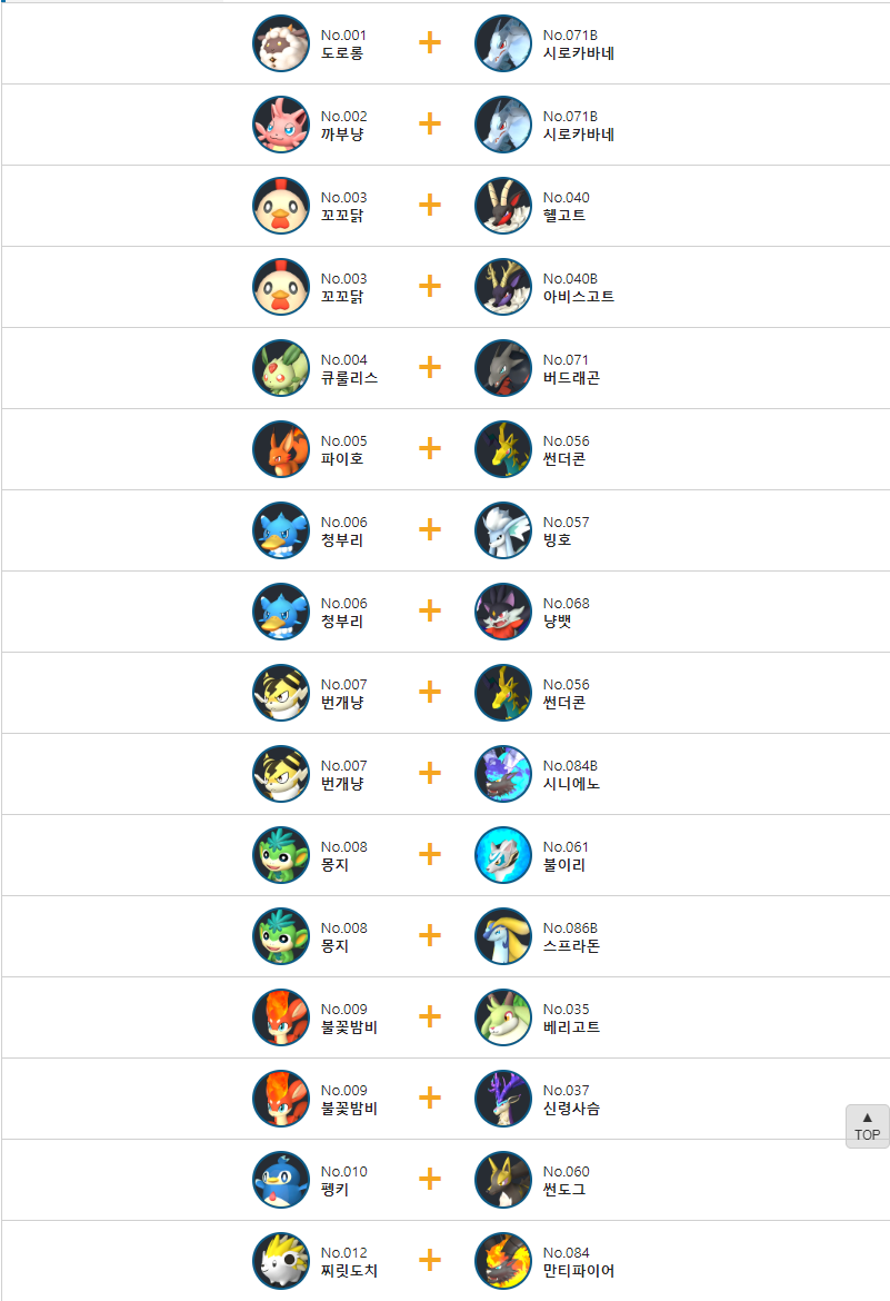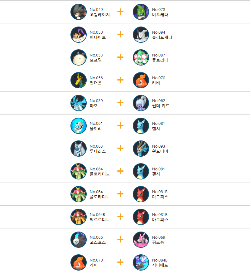 고릴레이지의 교배 배합표는 다음과 같습니다.