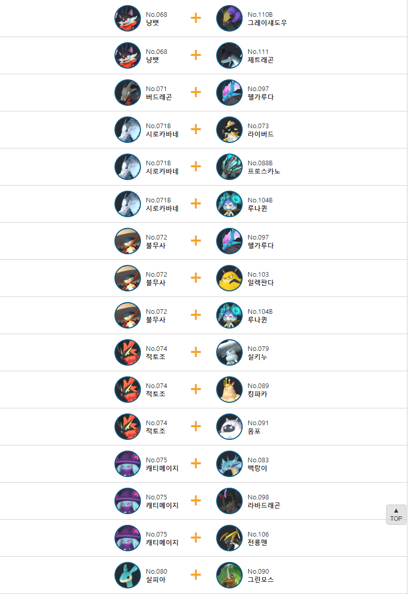 나이트윙의 교배 배합표는 다음과 같습니다.