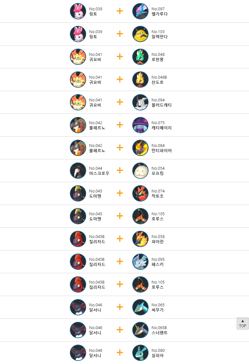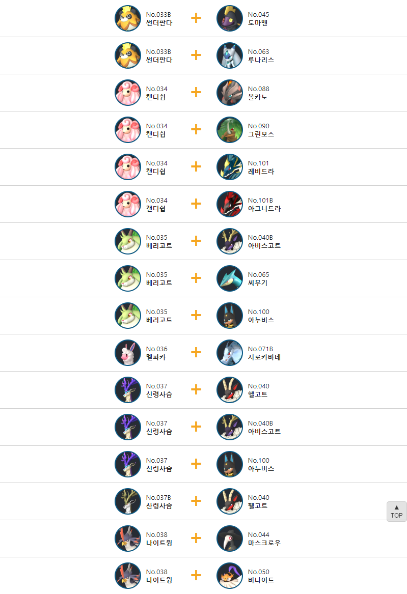 냥뱃의 교배 배합표는 다음과 같습니다.
