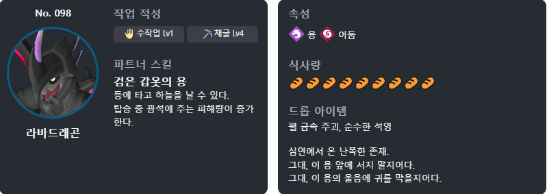 라바드래곤의 작업 적성 및 스킬은 다음과 같습니다.