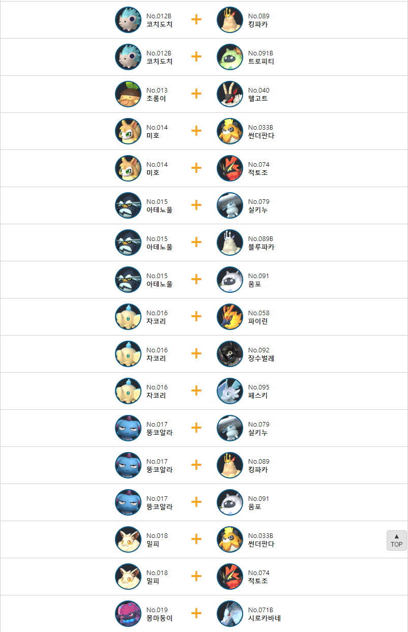 신령사슴의 교배 배합표는 다음과 같습니다.