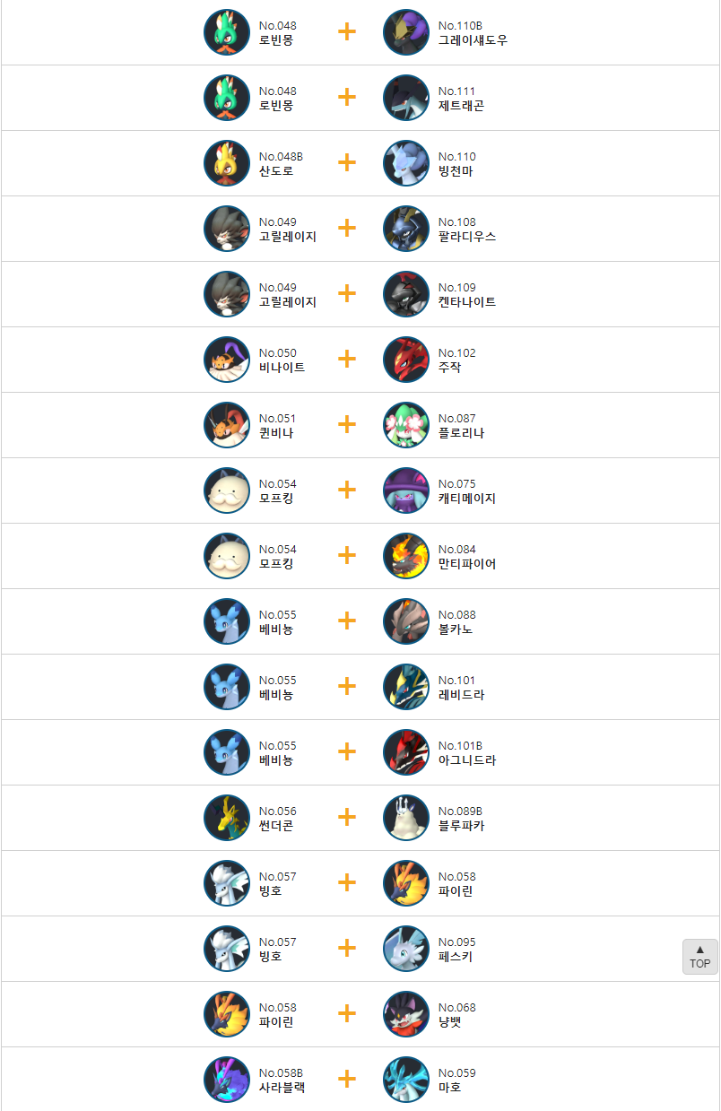 씨무기의 교배 배합표는 다음과 같습니다.