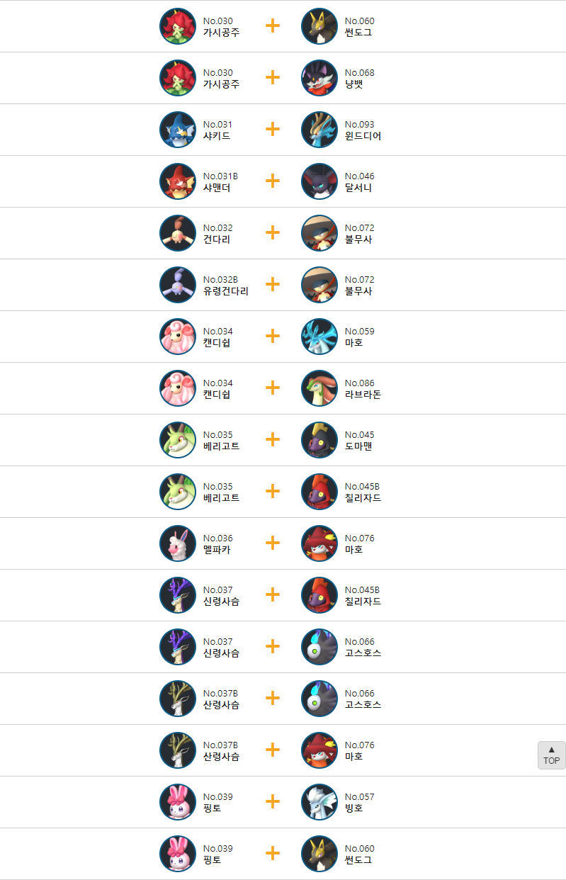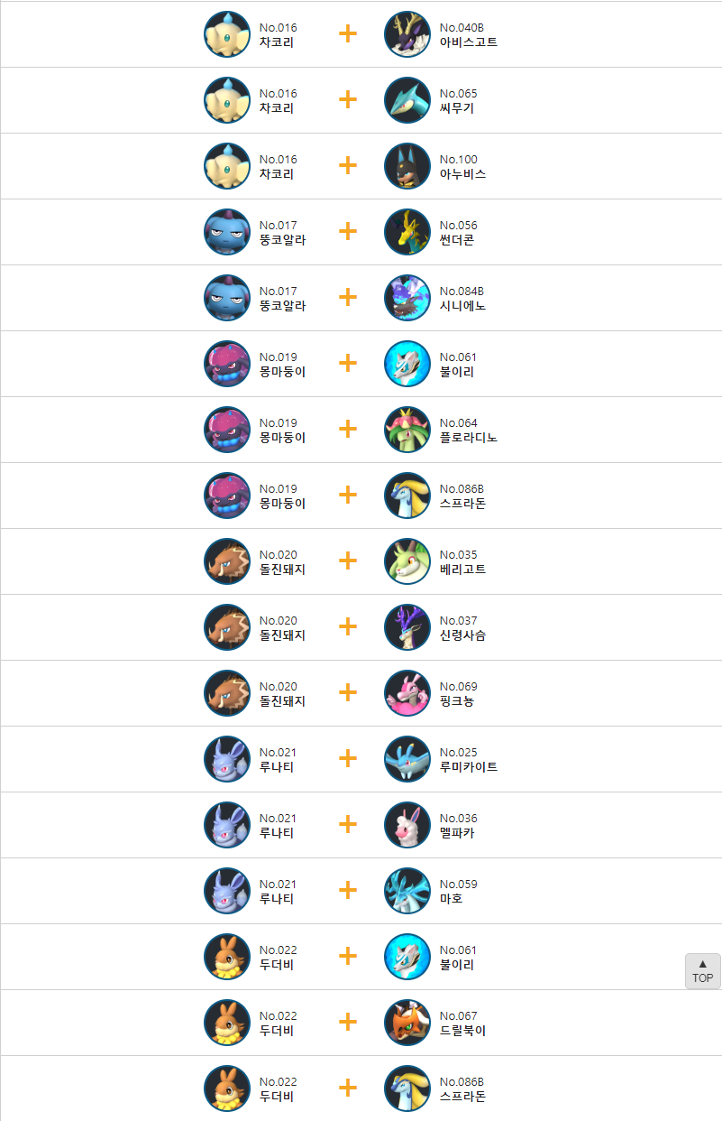 질풍수리의 교배 배합표는 다음과 같습니다.