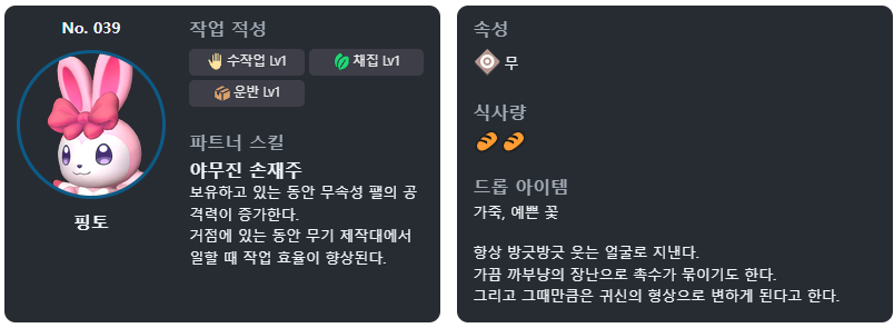 핑토의 작업 적성 및 스킬은 다음과 같습니다.